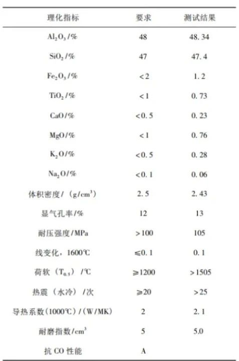 沸騰氯化爐內(nèi)襯材料主要采用Al?O?和SiO?,物相組成主要為莫來石,主要化學(xué)成份及物理性能測試見表1。