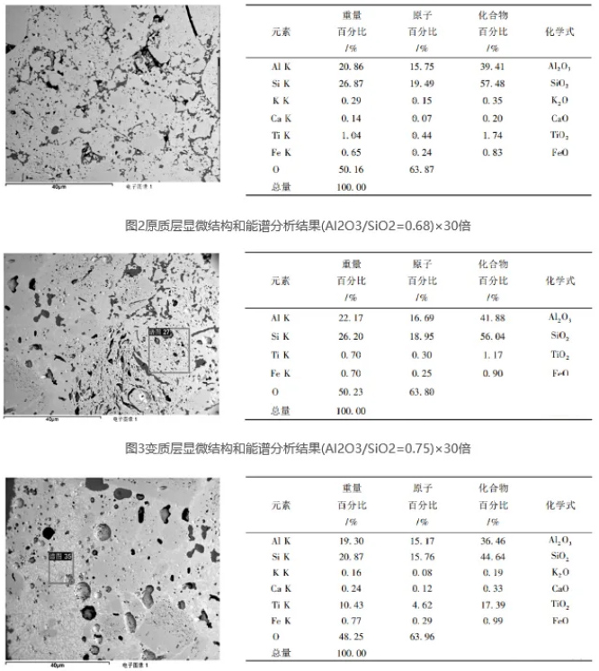 從熱力學(xué)上看,Al?O?-SiO?系材料[4]各物相在氯化反應(yīng)中:莫來石相(A?S?)非常不穩(wěn)定,其成份見表2,石英相(SiO?)非常穩(wěn)定,剛玉相(Al?O?)居中;在碳熱還原中:石英相非常不穩(wěn)定,剛玉相非常穩(wěn)定,莫來石相居中。在實際中,爐襯材料是如何損壞的,其過程是怎樣發(fā)生的,這要從殘磚顯微結(jié)構(gòu)分析入手。