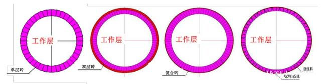 回轉(zhuǎn)窯焚燒爐非常關(guān)鍵設(shè)備即為回轉(zhuǎn)窯本體, 因其是一種動(dòng)態(tài)運(yùn)轉(zhuǎn)設(shè)備,對(duì)內(nèi)襯結(jié)構(gòu)設(shè)計(jì)要求較高,首先要確保耐火內(nèi)襯在動(dòng)態(tài)高溫狀態(tài)運(yùn)行下整體內(nèi)襯的穩(wěn)定性,防止耐火磚掉磚、抽簽等問題。對(duì)于危廢回轉(zhuǎn)窯系統(tǒng)而言,由于轉(zhuǎn)速比較慢,一般在1轉(zhuǎn)/分以下,可以根據(jù)廠房設(shè)計(jì)和節(jié)能要求選擇單層磚、雙層磚、復(fù)合磚和整體澆注等不同結(jié)構(gòu), 如圖3所示。回轉(zhuǎn)窯耐火材料總厚度一般是250~300mm不等,其中工作層耐火磚材質(zhì)一般根據(jù)處理溫度和危廢種類不同,可以選擇高鋁質(zhì)、剛玉莫來石質(zhì)以及鉻鋯剛玉質(zhì)耐火材料等。