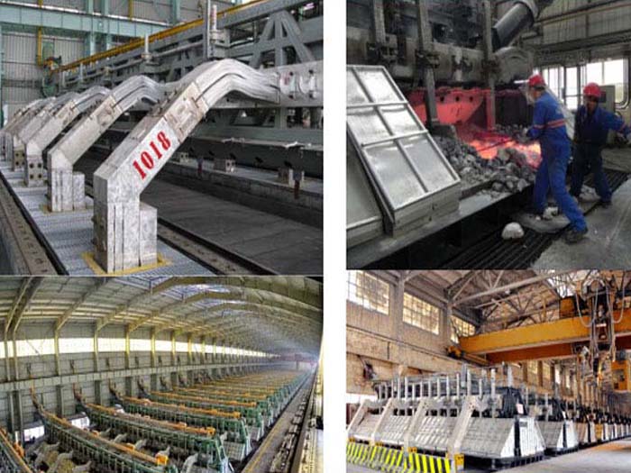 鋁電解槽通常為矩形鋼殼,內(nèi)襯碳磚。電解槽中懸有一碳陽ji,其碳質(zhì)槽底為陰ji。電解還原出來的金屬鋁熔體沉積于槽底陰ji。陽ji放出的氧與碳陽ji反應生成CO與CO2。槽內(nèi)電解質(zhì)與鋁保持熔融狀態(tài),隔一定時間從槽內(nèi)放出鋁液,并向槽內(nèi)加入一定量的Al2O3與冰晶石(3NaF.AlF3)等。電解溫度為900~1000℃。