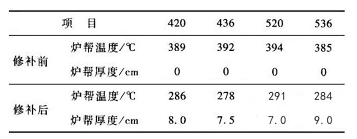 電解槽側(cè)部內(nèi)襯破損部位修補前后爐幫溫度及爐幫厚度的測量對比分析結(jié)果見表2。
