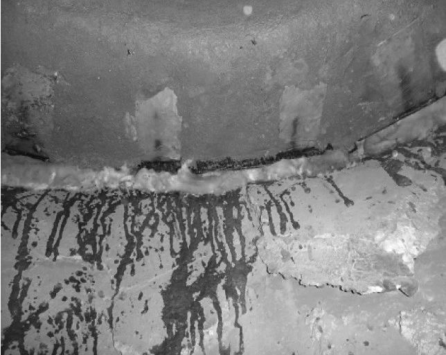 3、耐磨可塑料施工??伤芰戏笤O(shè)在施工構(gòu)件上后,用木錘或橡皮錘搗打密實(shí)。塊與塊之間的接縫也應(yīng)搗打密實(shí),使接縫嚴(yán)密,將表面壓光、壓平。所施工部位與原來墻體接縫處應(yīng)確保平滑過渡,不得凹進(jìn)或凸出。用磷酸鋁溶液浸泡硅酸鋁纖維板封堵膨脹縫,避免鍋爐運(yùn)行過程中出現(xiàn)竄風(fēng)現(xiàn)象,導(dǎo)致非金屬補(bǔ)償器燒損。耐磨可塑料施工完畢后的膨脹縫封堵如圖4所示。