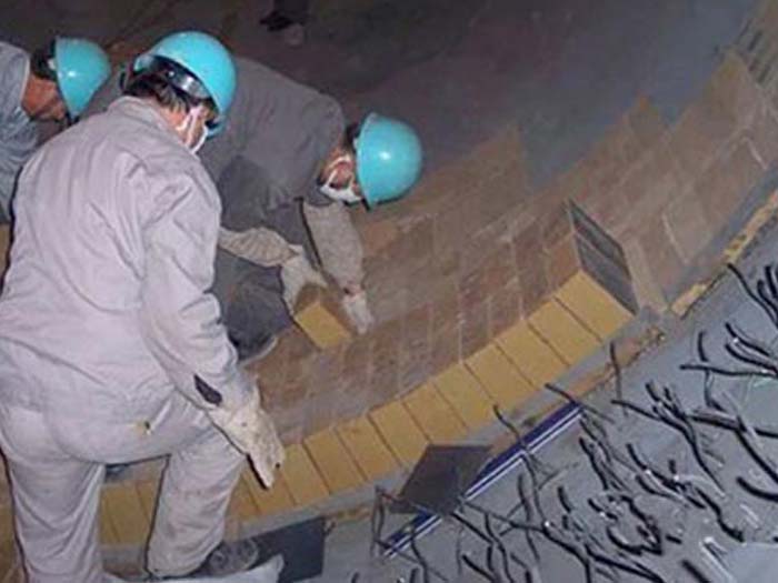 特別在開(kāi)停較頻繁的窯上使用,壽命大為縮短,沒(méi)有窯皮做為屏障的鎂鉻磚,表面溫度隨窯況變化,窯皮頻繁更替,會(huì)使膨脹系數(shù)較大的鎂鉻磚發(fā)生熱疲勞,化學(xué)侵蝕,液相堿鹽的滲入使磚結(jié)構(gòu)惡化,降低抗熱疲勞性能,使胴體溫度在此幾環(huán)鎂鉻磚處不斷升高,更終紅窯,為了補(bǔ)掛窯皮在胴體表面噴水強(qiáng)制在火磚上形成窯皮,但窯的受熱膨脹對(duì)磚襯內(nèi)壓應(yīng)力補(bǔ)償作用消失,不利于磚襯壽命,加之,磚體太薄不能形成穩(wěn)定窯皮,多次紅窯。只有進(jìn)窯挖補(bǔ),磚更薄處只有40cm左右。在窯口處2m處的鎂鉻磚也出現(xiàn)過(guò)類(lèi)似情況。